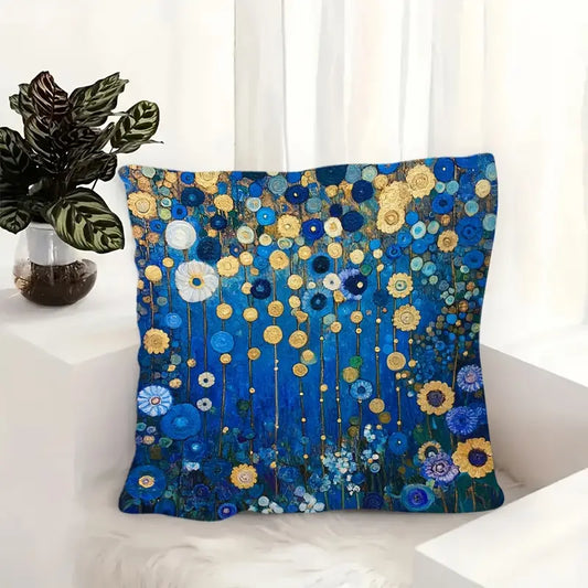 1 Gustav Klimt Style Blue and Golden Abstract Garden Flowers Cushion